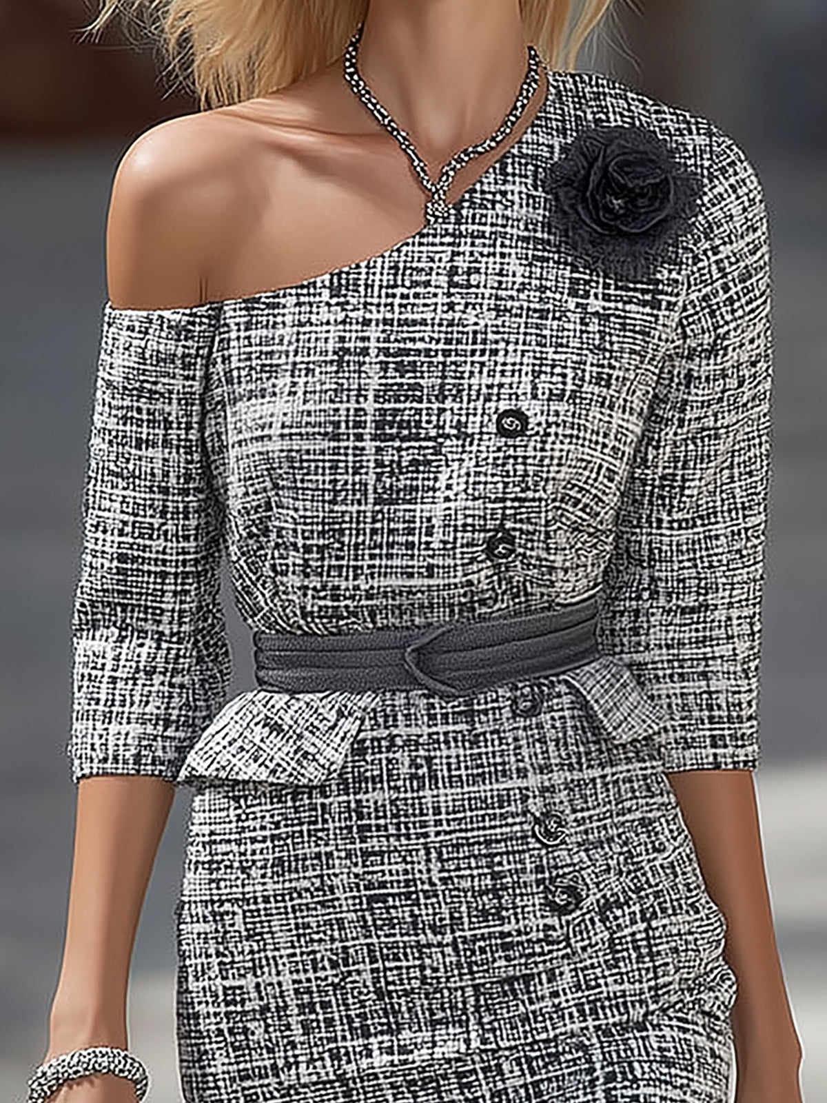 Make a bold fashion statement with the Asymmetrical Tweed Dress with Chest and Waist Accessories—a modern, chic design crafted for the confident and stylish woman.