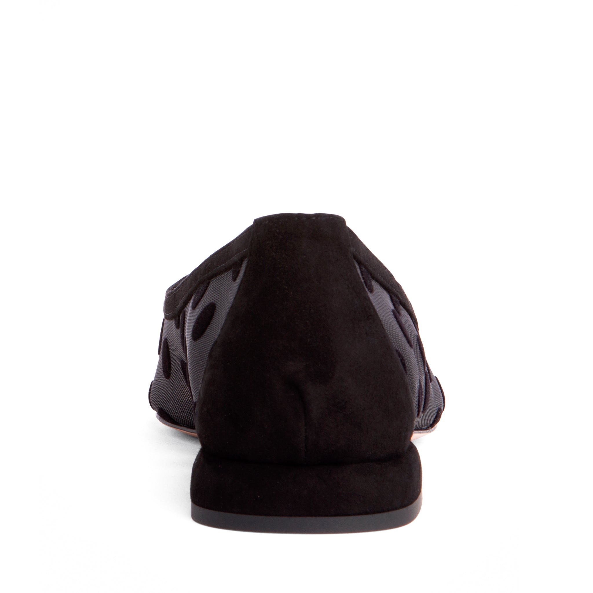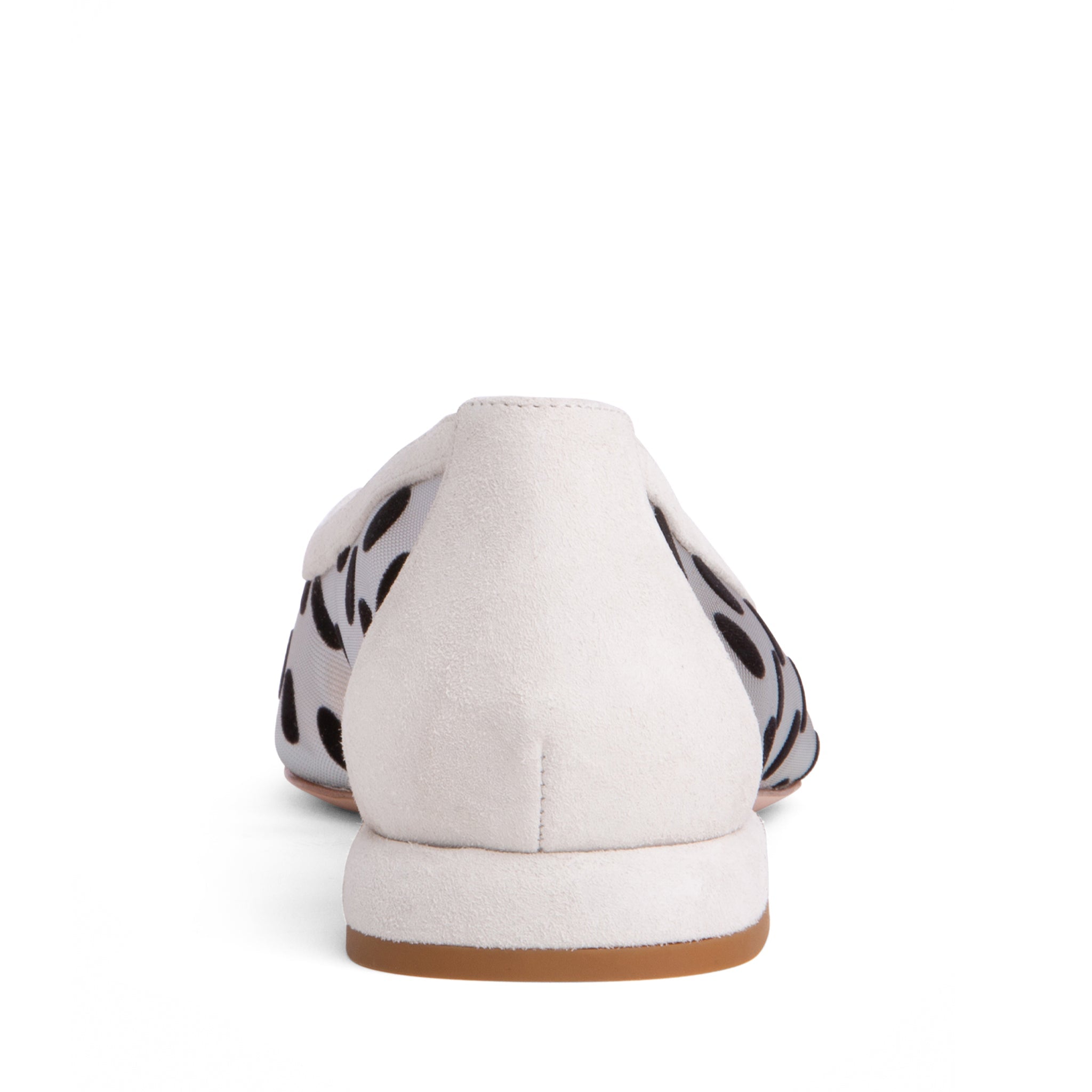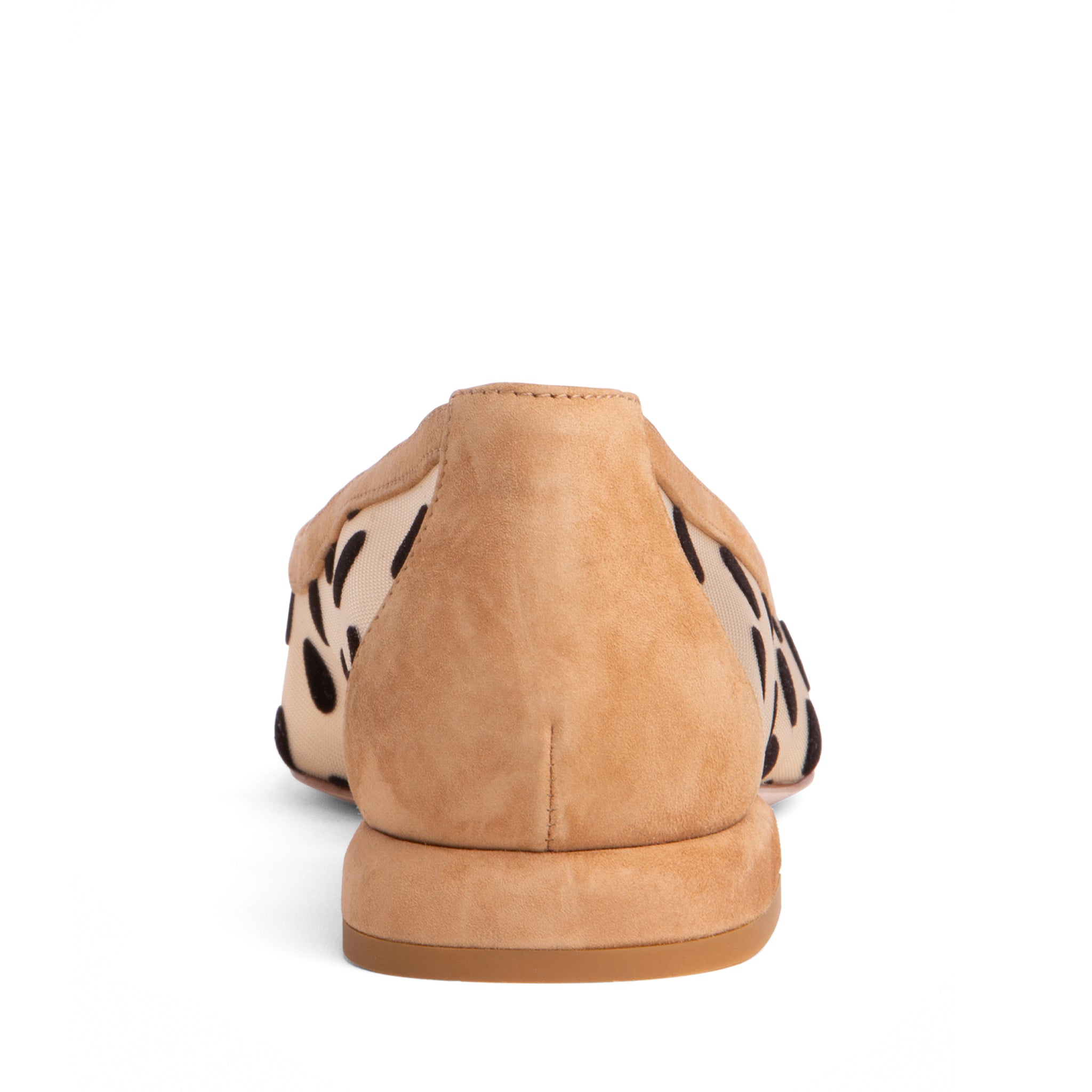 Coquette ballerina crafted in a blend of camel mesh, polka dots, and suede.