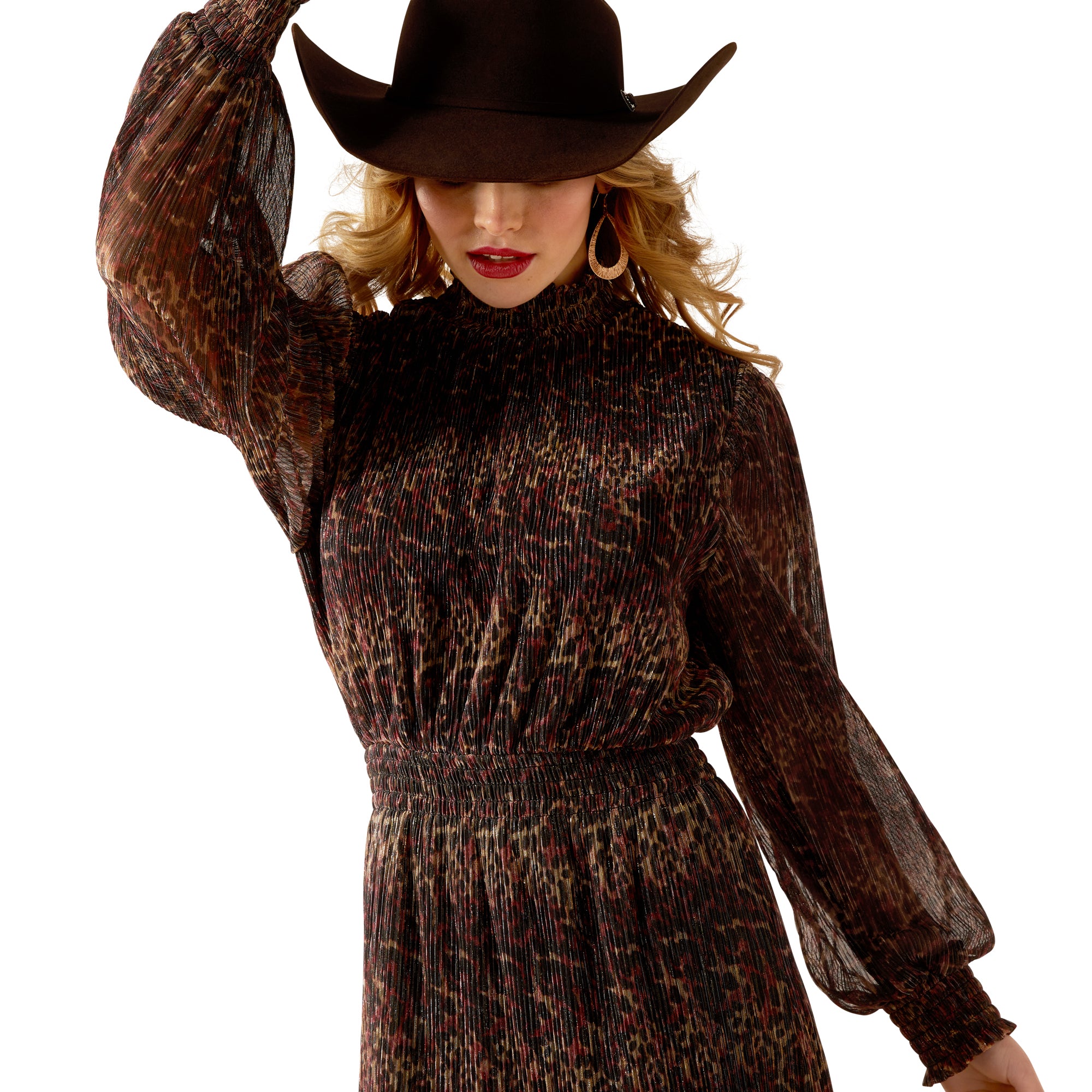 Fun, flirty, and here to party. With an eye-catching, is-that-leopard? print, this pleated dress will keep them guessing all night long. Gold metallic thread adds subtle shimmer, while the long sleeves and mock neckline elevate the entire look.