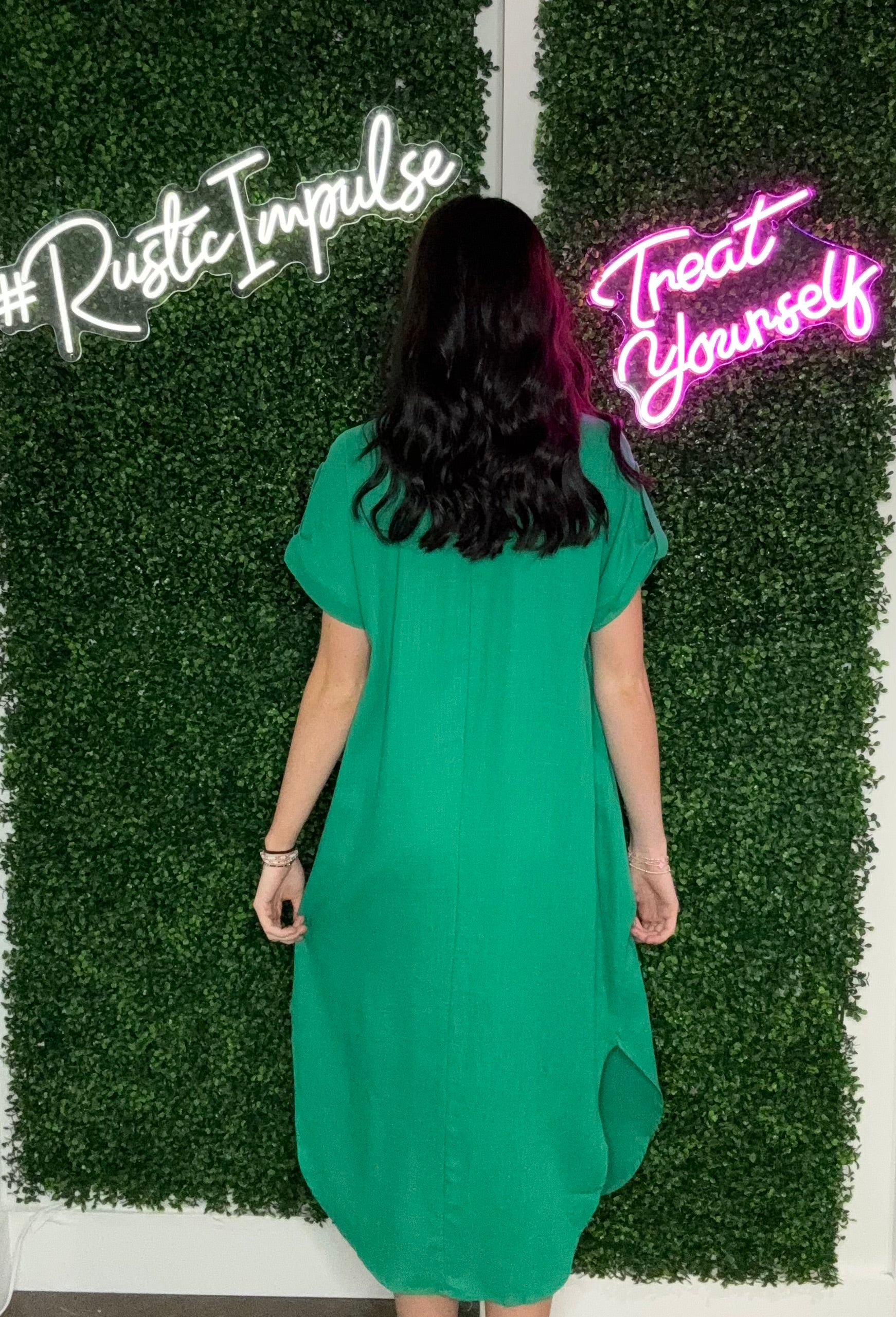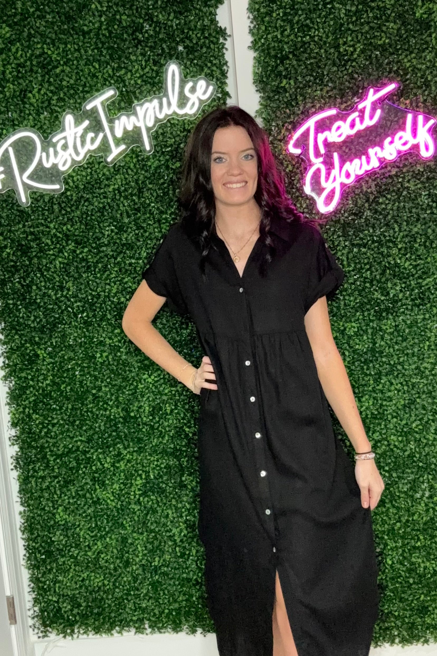 Oversized Solid Linen Woven Midi Dress- Drop Shoulder- Short Roll-Up Sleeve- Button Up- Maxi Dress- Round Hem70% Viscose, 30% Linen
