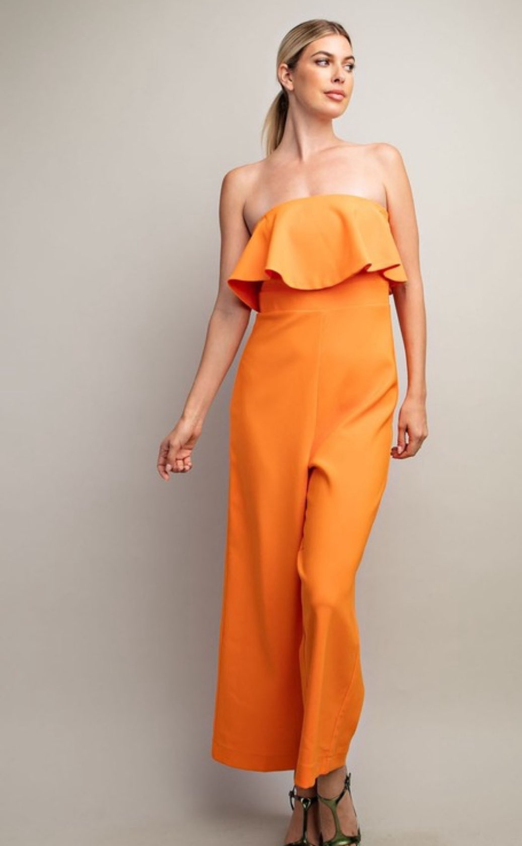 Over flounce ruffled strapless wide leg jumpsuit92% Polyester 8% Spandex