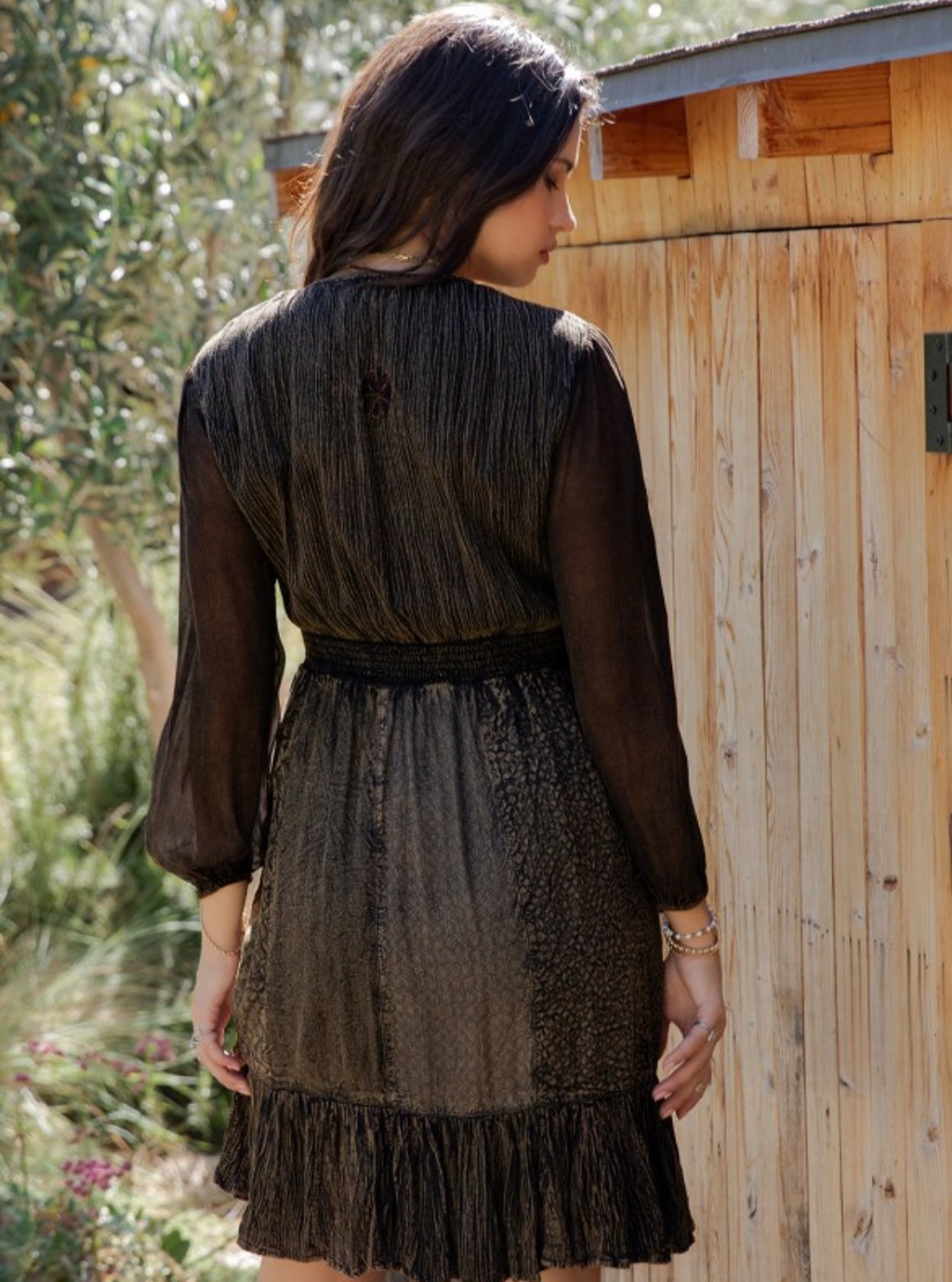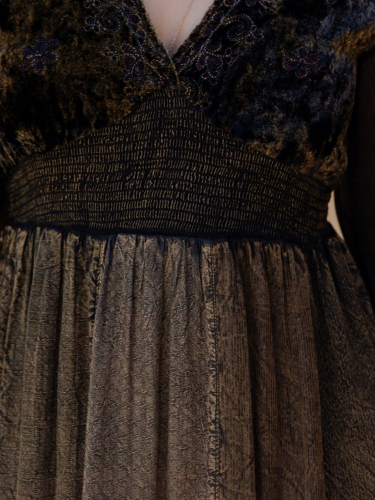 Style: Patchwork smocked waist babydoll dressMaterial: Rayon crepe, perfect for fall and winter Embroidery: Aari embroidery on the V-neck for a detailed, boho lookDesign: Smocked waist with a V-neck and 3/4 sleeves for a flattering fitLength: Above the knee or mid-thigh for a relaxed silhouetteTexture: Soft and slightly textured rayon crepe fabric Comfort: Light yet cozy, ideal for cool-weather wear Care Instruction: Hand wash for best care Details: A charming patchwork babydoll dress with smocked waist and aari embroidery, offering a stylish, comfortable look perfect for the fall and winter seasons.Disclaimer: Due to the unique nature of patchwork design, each product will be unique.Fabric Contents:VISCOSE