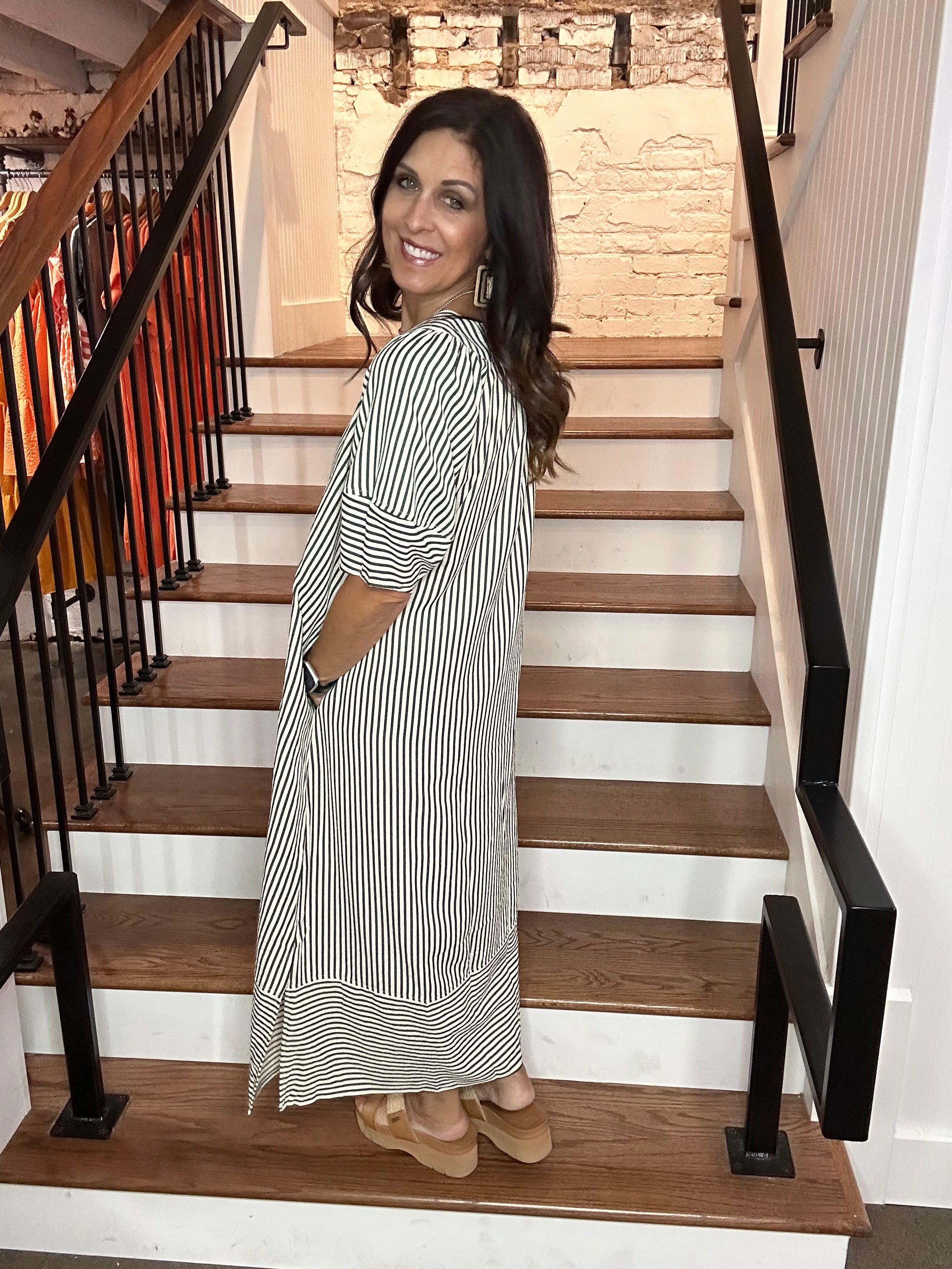 Stripe pattern textured pullover midi dress features raglan lantern sleeves and slit side hems. Pockets at side. Lined. Woven. Non-sheer. Lightweight.Fabric Content 100%POLYESTER